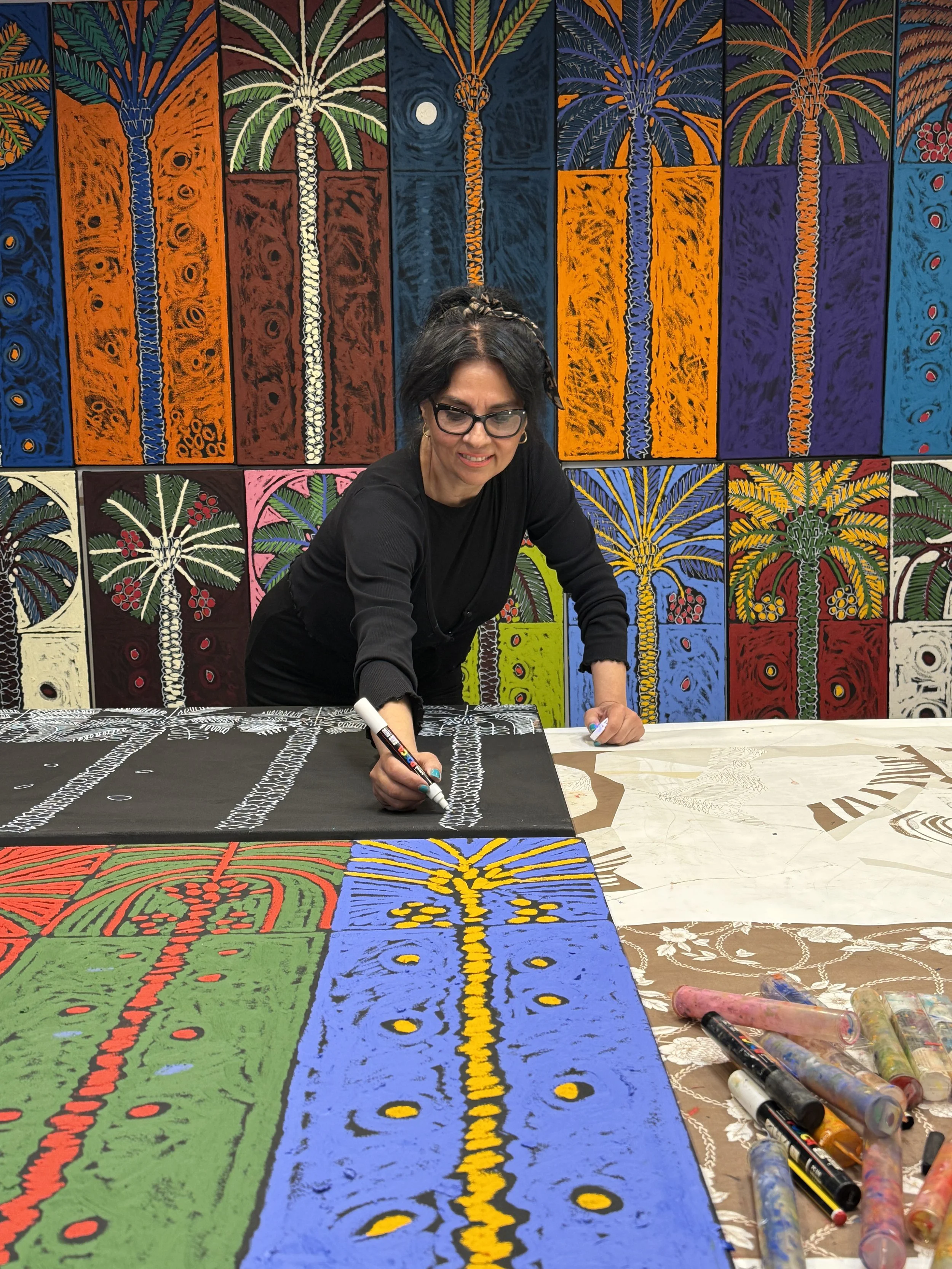 Her diverse cultural experiences have profoundly shaped her artistic vision. Faraj’s work reflects an aesthetic informed by architectural discipline, and weaves references that bridge East and West, ancient and contemporary, public and deeply personal. Exploring themes of spirituality and the transience of human existence, she employs a visual language of vibrant colour and basic geometric forms, seeking harmony and order.