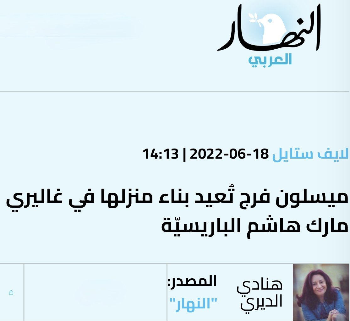 2022 ARTICLE Maysaloun Faraj Reconstructs her Home at Mark Hachem Gallery by Hadani Dairi for Annahar Newspaper, 18 June 2022.