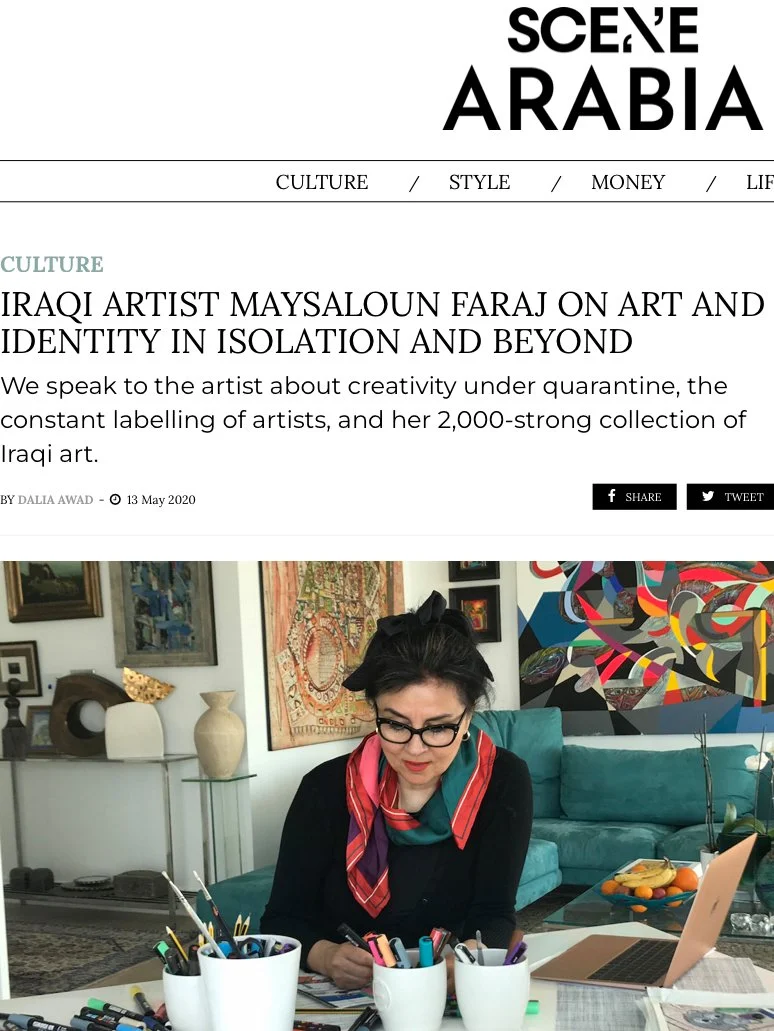 2020 ARTICLE Iraqi Artist Maysaloun Faraj on Art And Identity In Isolation And Beyond, Scene Arabia by Dalia Awad, 13 May 2020.